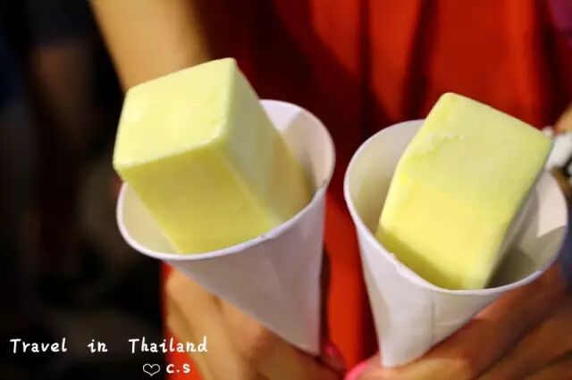 泰国有一种雪糕一定要尝尝,那就是榴莲雪糕。雪糕是长方形的,和牛奶、咖啡、绿茶等各种口味放在一个柜子里,金黄色的就是榴莲味道的,是雪糕里最好吃的,可谓雪糕之王。