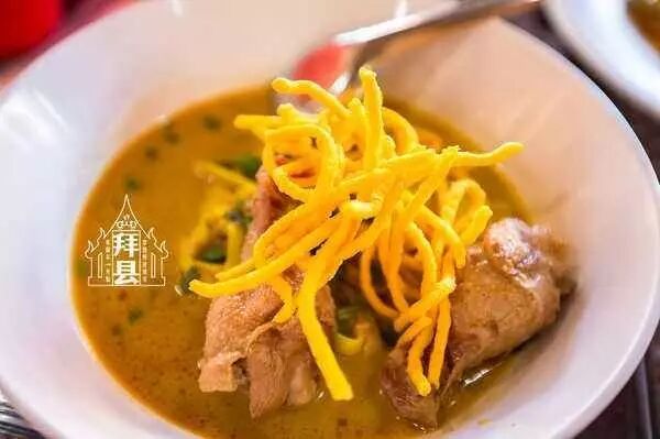 咖喱面(Khao Soi)是泰国北方饮食的代表,这种口味相对清淡的炖煮咖喱鸡肉和加了鸡蛋的宽面,是泰北人民最喜爱的早点之一。据说这是从云南流传过来的食物,后来成为当地人家常的食物。咖喱鸡肉面用椰浆红咖喱放入两种面条,一种是炸脆的一种是煮软的,加一个蛋和鸡肉。吃的时候可以放入豆芽,咸菜和洋葱。
