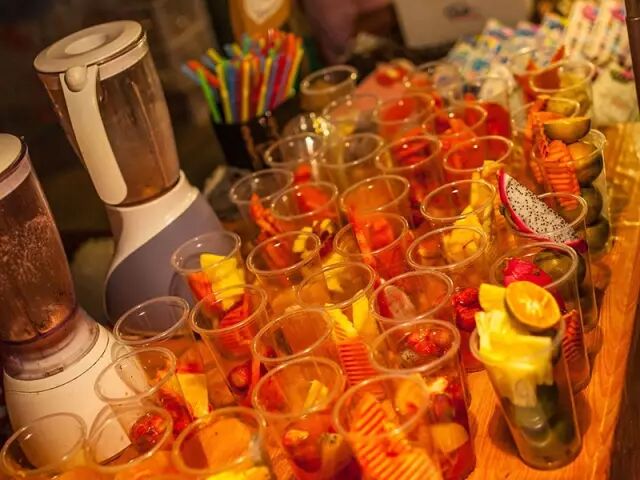 Fruit Shake是每个到泰国的游客大赞的全民饮品,采用新鲜水果、冰块、糖浆,在搅拌机中打碎混合的沙冰。在一个沙冰摊上往往可以有几十种口味的水果可以选择,也可以选择多种水果混合。