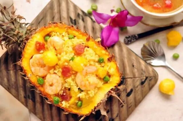 泰式菠萝炒饭,运用泰国香米的香气,搭配菠萝以及什锦蔬菜等大火快炒,咸咸酸酸甜甜的口感,才吃一口就会让人食欲大开,撘配腰果一起入口,口感层次丰富,尤其把饭装在菠萝里一起上桌,视觉效果奇佳。