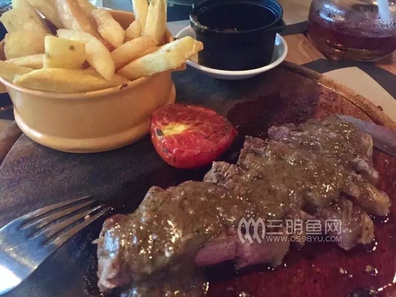 选这家店是因为一开始是被牛排的广告海报吸引的,海报上的牛排又大又厚,好心动。再加上门口迎宾的妹纸会说中文很热情的向我们介绍餐厅各种菜,我们就决定进去一试。原来并不是所有广告都是骗人的,牛排很棒啊,肉厚又多汁!