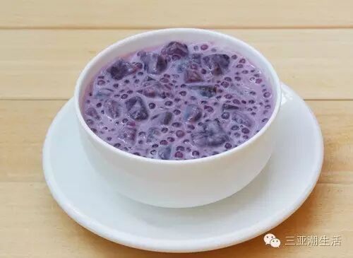 椰汁西米露。香浓的椰汁加上晶莹剔透的西米,两者相结就可以成为了风味独特,香醇可人的美妙食饮,椰香飘逸,西米软糯,加上紫薯一起熬制,那真是色香味更佳!
