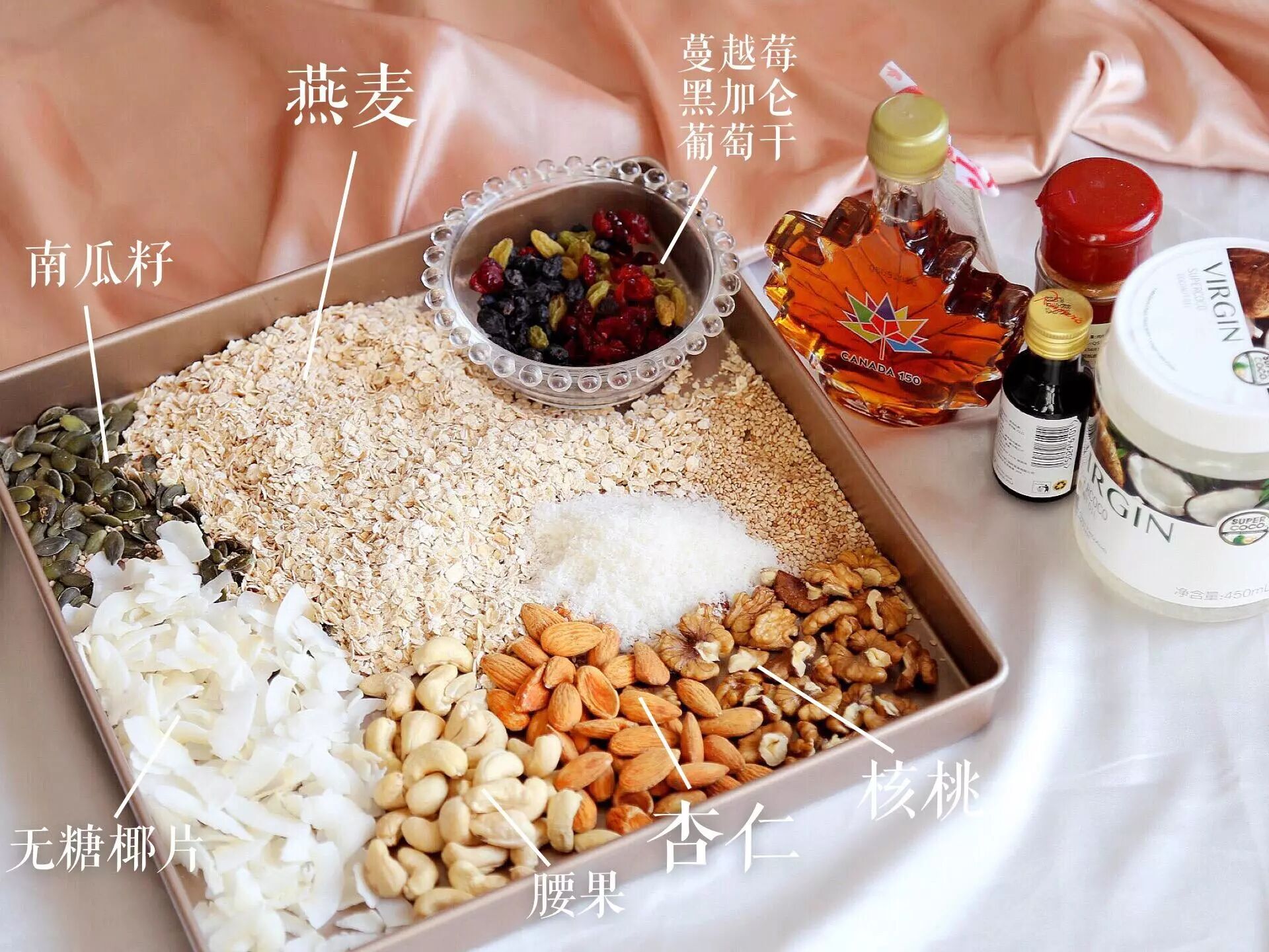 燕麦、南瓜籽、无糖椰片、腰果、杏仁、核桃、蔓越莓、黑加仑、葡萄干。
