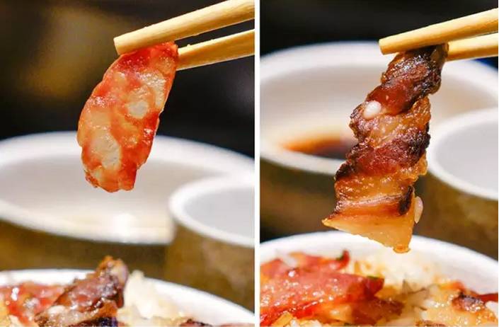 ▷偏瘦的腊肠均匀分布着油脂,搭配着头抽的鲜味,肠衣要脆,咬起来爆汁才吃得爽。如此讲究的食材,味道怎能不好?金黄的饭焦吸收了腊味的油脂与香味,煲仔饭的精华就在此,绝不可错过。