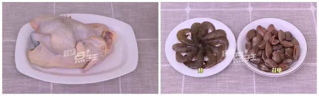 土鸡选3斤左右的,洗净后去掉头尾,砍成2厘米大小的块状。海鲜洗净后放在一旁备用。▽