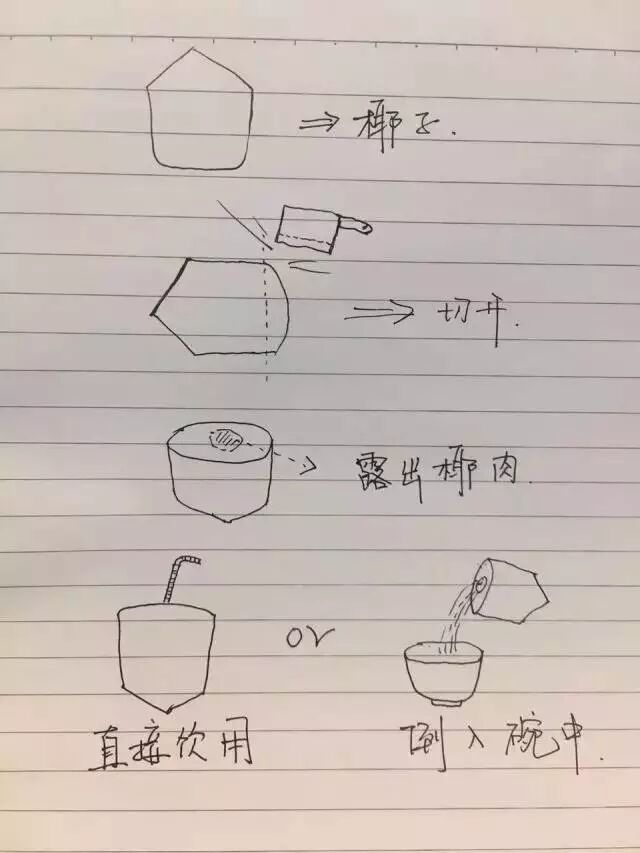 尝:椰汁几近透明,香味四溢。变坏的椰汁,呈酸味,含凝固状物。
