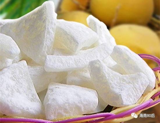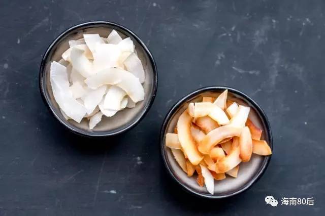 把椰子肉削成面积稍大的薄片,烘干,加上调味,就变成夏天里负担最轻的天然小零食:椰子片。