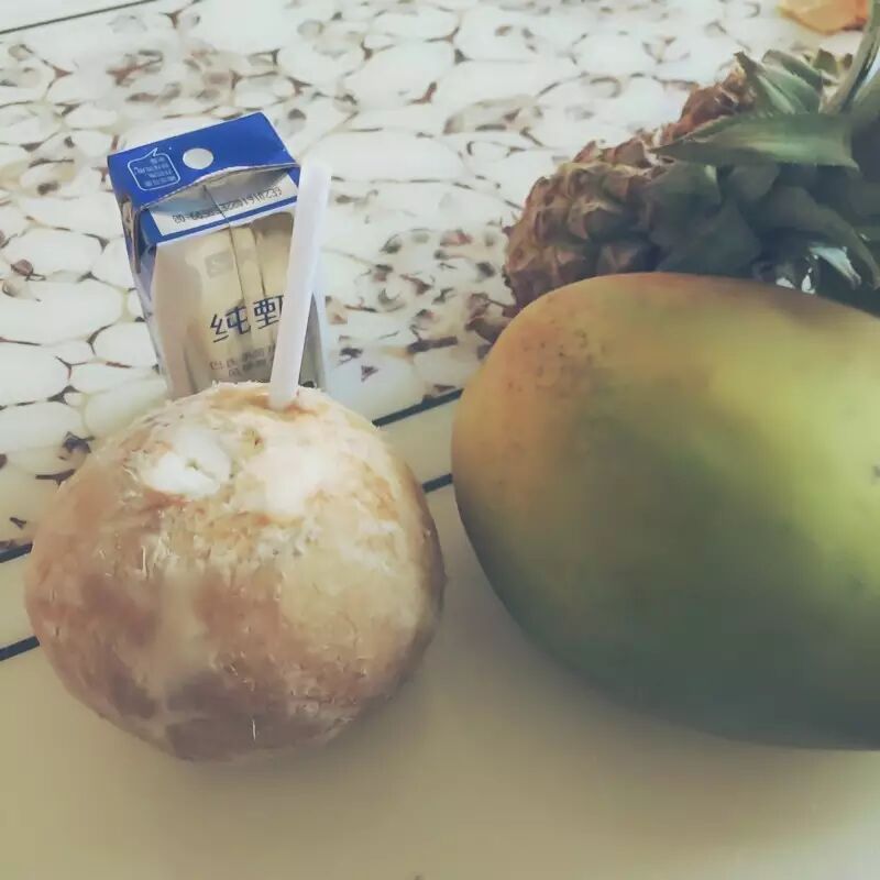 这一整桌的热带水果还带着海南的味道,不过好像还是椰子更加吸引鱼先生,抱着不放。