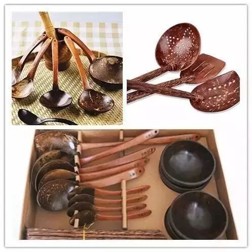 椰壳厨具:海南小椰壳实业有限公司制作的椰壳厨具经过42道工序,环保、无毒,厨具系列产品有水勺、汤勺、饭勺、调羹、锅铲、漏勺、粥勺等,椰雕厨具工艺者将废弃的椰子壳加以全面利用,变废为宝,物尽其用。