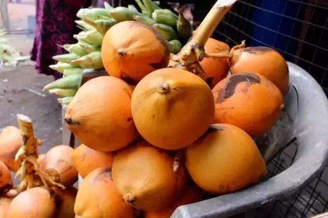 ▲黄金椰比青椰少见,在万宁街头仍有很多。金椰外表通体黄色,跟青椰长老后的枯黄色有很大不同。金椰的汁水香甜,椰味浓郁,非常可口;椰肉很厚,色白如玉,芳香脆滑。价格也相对比青椰红椰贵。金椰相对圆,红椰比较长。