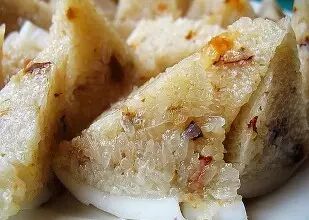 ▲椰子糕是海南特色小吃中的一种,听名字就能猜到其味道与椰子有关。海南人都亲切地称它为yibua(海南话发音)。椰子糕呈扁圆型,有碗底般大小,外面用椰叶或香蕉芭蕉叶裹成。除了具有年糕的绵软特点外,其馅是最大的特色。一般有椰丝花生馅和椰丝芝麻馅的。当然外面包的椰叶散发的香味也许更能够提起人的食欲。拨开糕底那层香蕉芭蕉叶,那香喷喷的粘粘软软椰子糕就散发出一种若有若无的香味,吃上一口,椰子的香味,糯米的粘牙感和韧劲让人回味无穷,马上吃第二口,第三口。
