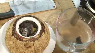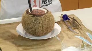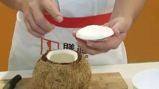 椰子顶部切开小口,倒出椰子汁备用.