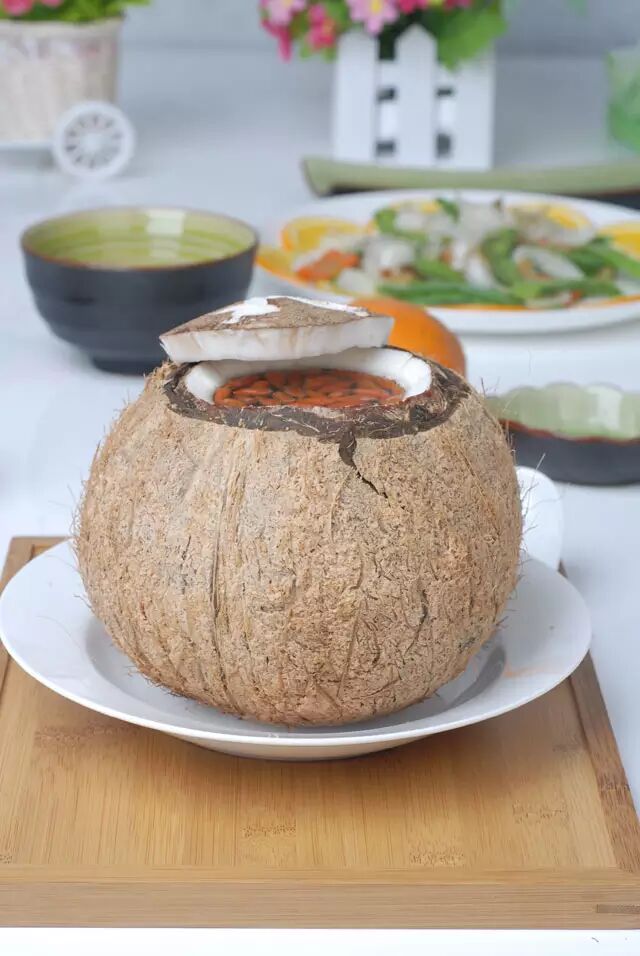 所有食材放入椰子里,倒入椰汁,盖上椰盖蒸制2小时。