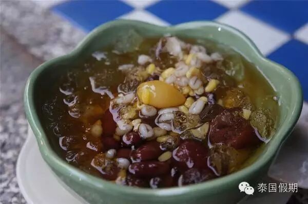 我们在一旁做着小鱼足浴苦苦等待,直到6点半,卖清汤的老太太才姗姗来迟,还是30泰铢,碗里加入薏米、芸豆、银杏、玉米粒等等,舀上糖水和碎冰,在每天被红咖喱绿咖喱黄咖喱轮番刺激之后,这糖水真是救世主般的存在。