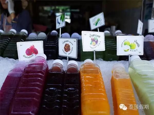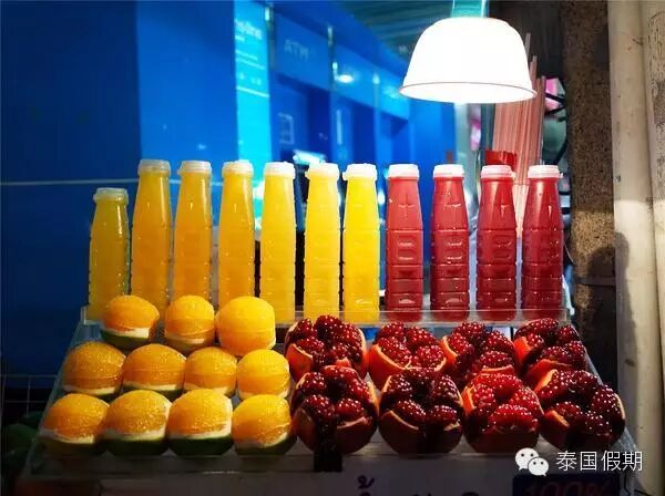 对了,怎么能忘记柑橘汁和石榴汁呢,耀华力路一路都是现挤现卖的果汁摊,大瓶三支120泰铢,不过24块,石榴汁红得鲜血一般,柑橘汁则成柔和的黄绿色,底下沉着不少果肉,如果说什么是满足的味道,那就是在闷热的傍晚暴走半个钟后,灌下一整支新鲜石榴汁,那个爽快。