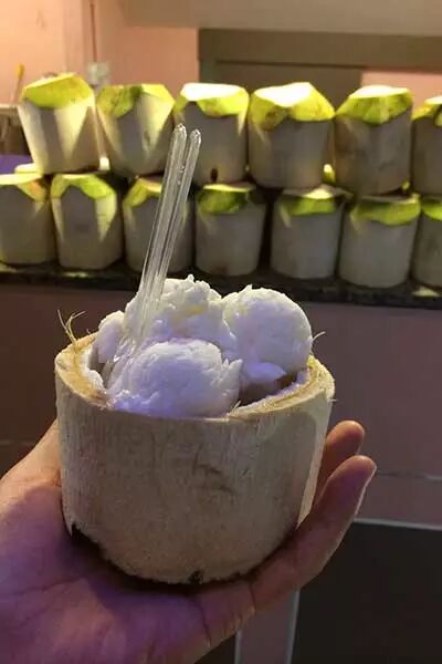 椰子冰淇淋先把椰汁沥出,然后挖走椰肉,接着加一点类似果冻的辅料,然后添加冰激凌球,最后加上面包粒和刚才挖走的椰丝,味道不错,分量也够足。