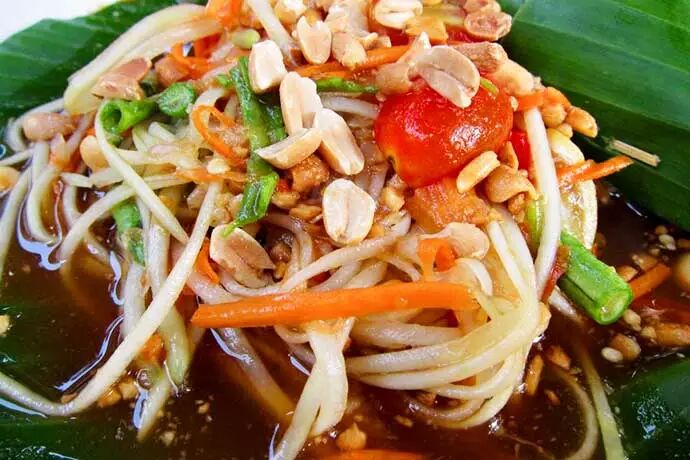 街边的青木瓜沙拉太地道了,在曼谷的餐厅里都不一定能有街边小吃摊的味道正点,因为做青木瓜沙拉的秘诀之处就是用那个木头棍子在碗里边捣边拌,加入新鲜的食材,五分钟出炉的才绝对能搞定你的味蕾。