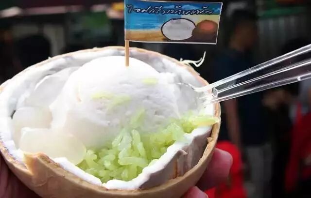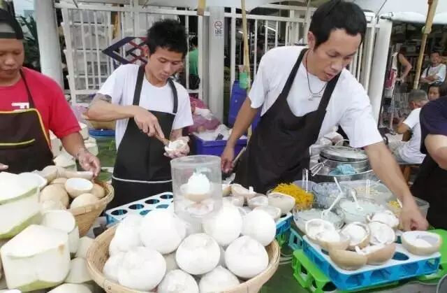 只要花上35泰铢(约合人民币7元),就能拥有一份清爽美味的椰子冰淇淋、切片椰肉,2款配料(糯米、椰果、花生、玉米,亚答子等)和一杯免费的新鲜椰子汁,是炎炎夏日最佳的甜品。