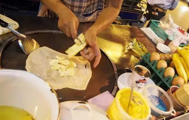 泰国人也把它称为Roti Prata。煎饼上一般会浇上炼乳,也可以选择蜂蜜、坚果、巧克力、椰子和糖等等,甚至还能加一个鸡蛋,味道十分香脆可口。这款小吃几乎到处都能找到,尤其在考山路一带。