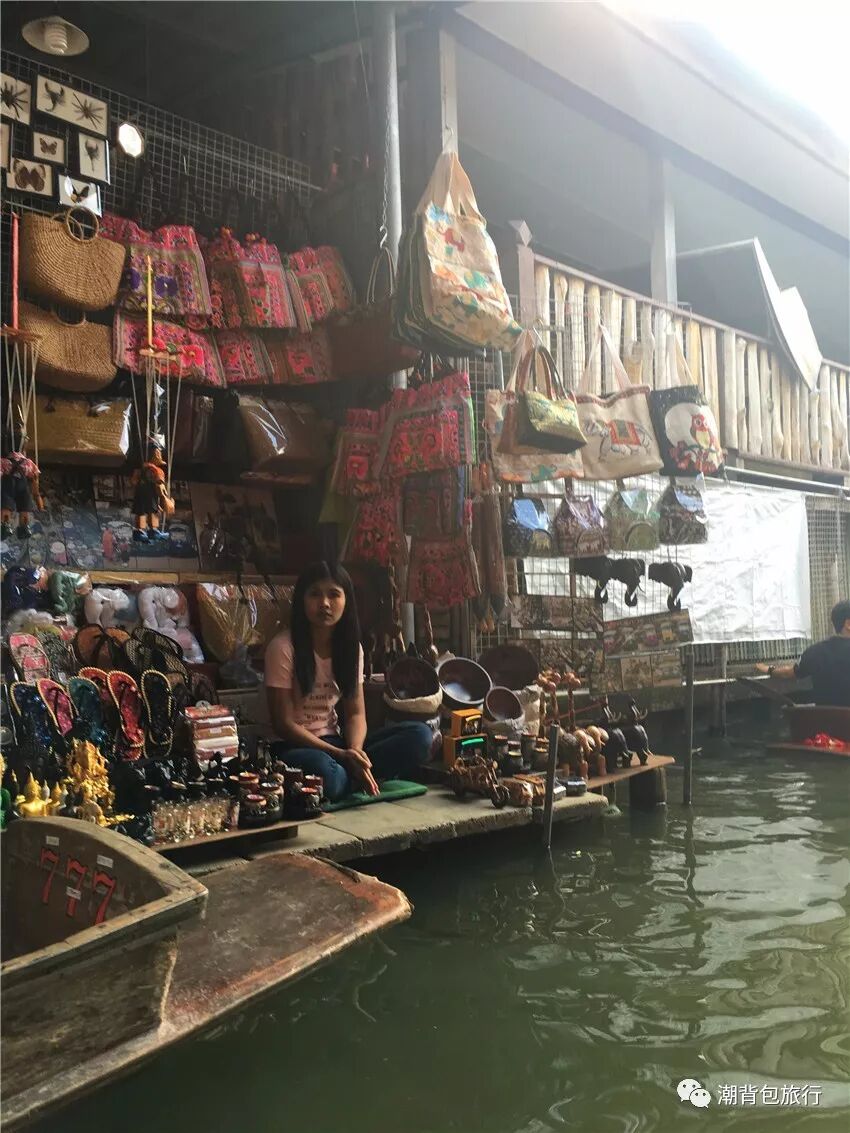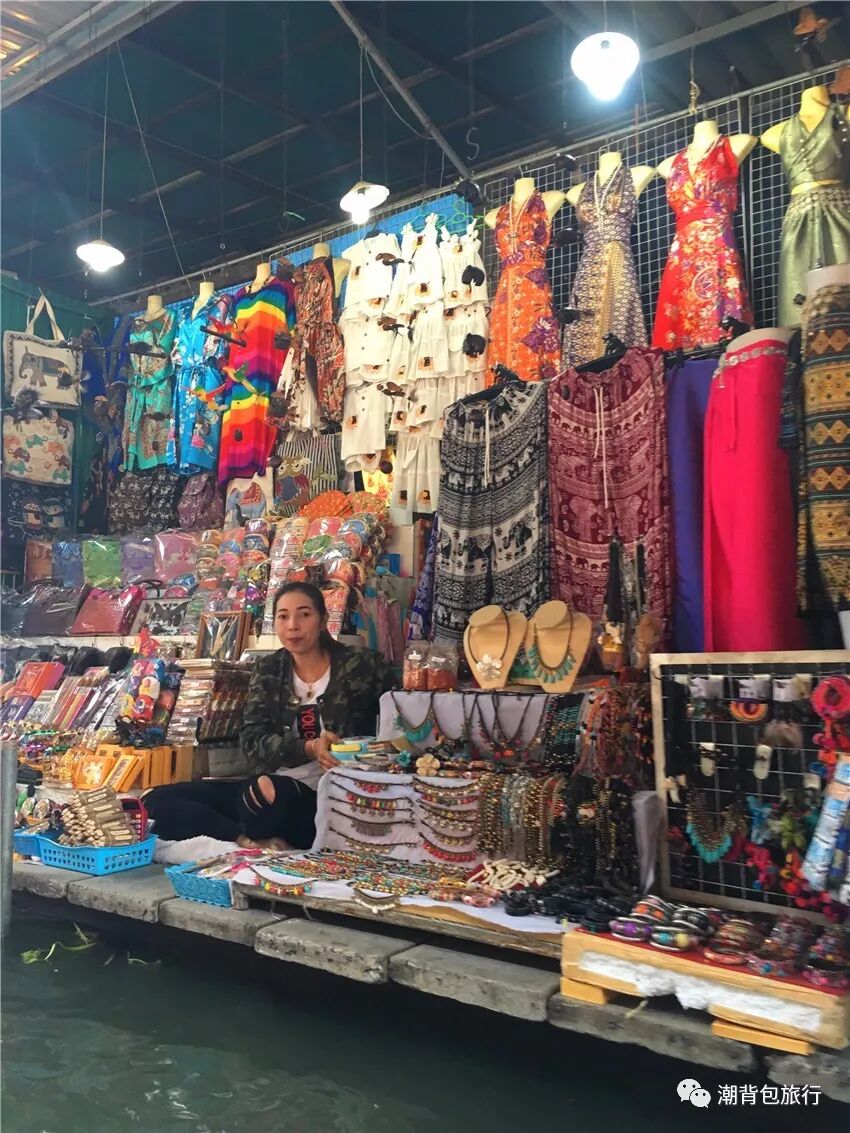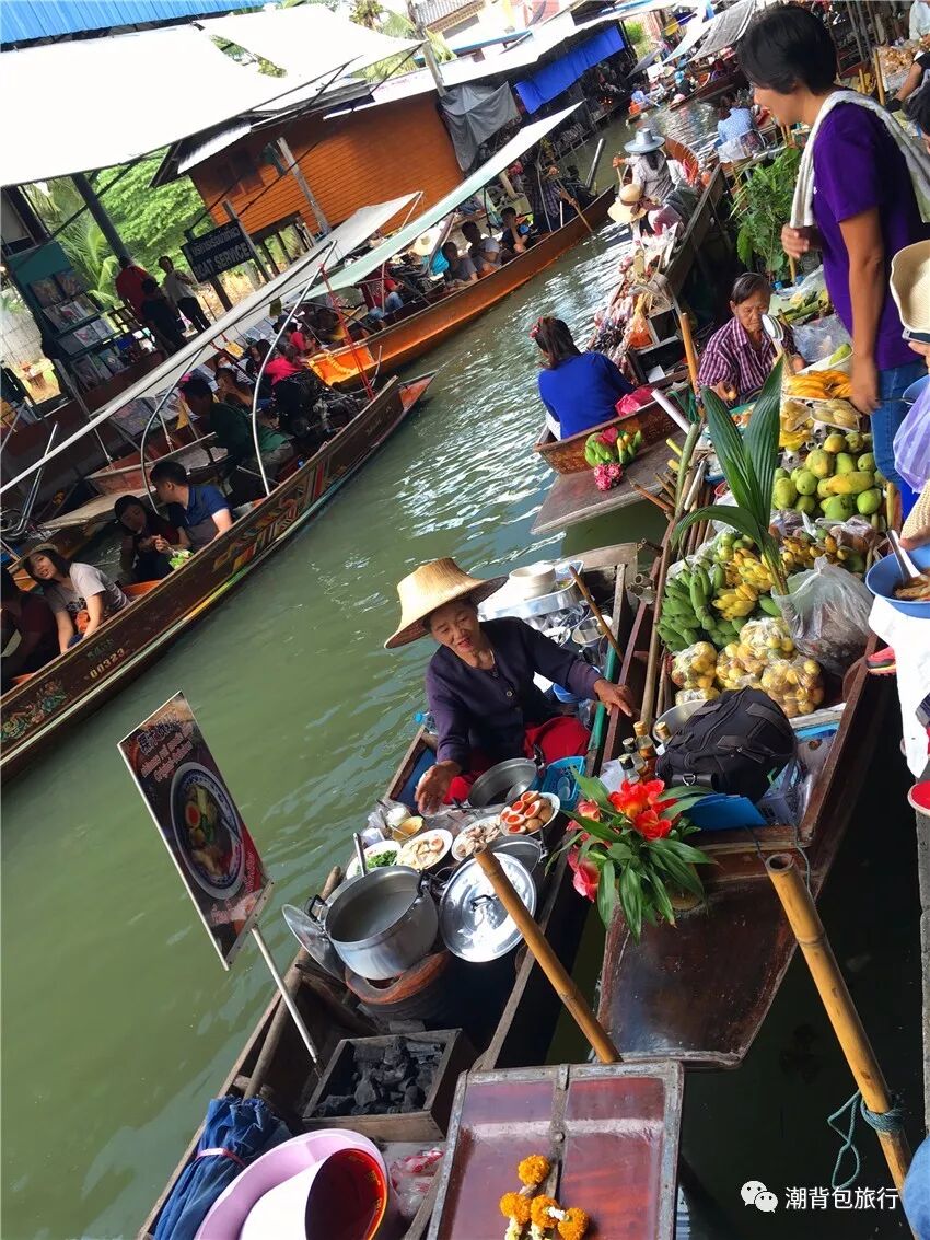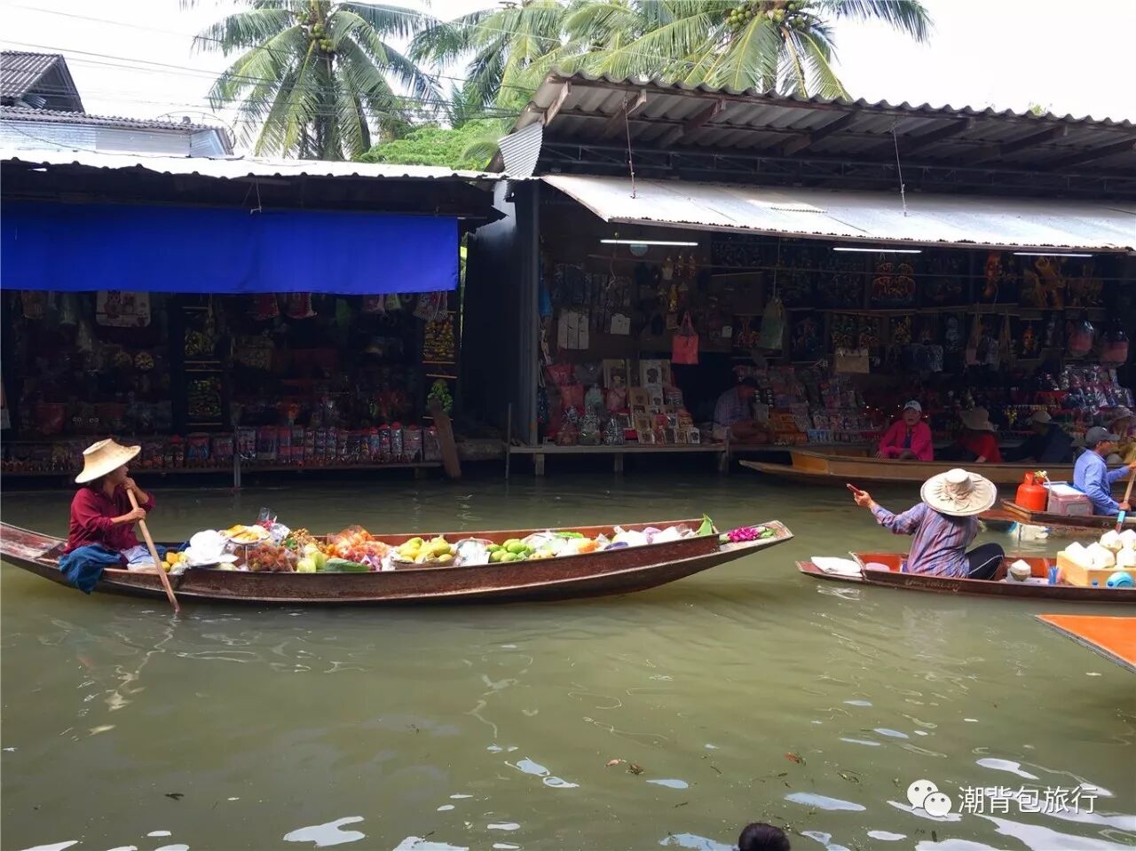 河的两边林立着有泰国特色的古老木造通透的建筑,建筑里是各式各样的商店,而河上一艘艘长尾船装载着杂货的各种小吃,烤虾,炸鱼饼,泰式炒河粉,蔬菜,水果一应具全。艇上的农民和小贩向游客兜售商品时,一般不上岸,他们以长竹竿为媒介,将花束、水果等递给游客。