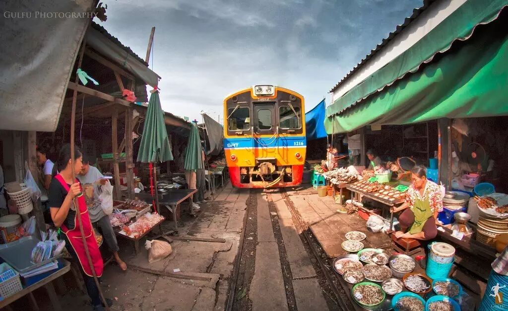 上午逛完水上市场,就可以去美功铁道市场了,如果没有火车开过,这里只是个普通的市场,卖着水果蔬菜水产粮食,当火车来临的时候,铁路两边的小摊贩纷纷收起棚子和小摊子,火车呼啸而过,他们就贴着火车站立在两旁。收摊收篷再摆摊放蓬,前后不过一两分钟,却足以让这个小地方吸引各地游客的到来。