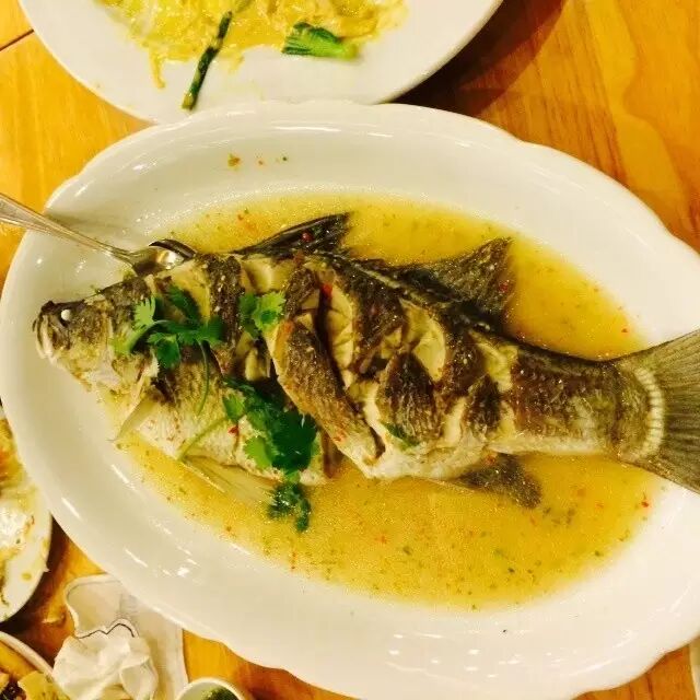 东哥说先吃饭吧,我肚子都饿得咕咕叫了。我听他这么一说,马上望望我姐,果然,我姐翻了个大白眼,哈哈,这两人真是可以去唱双簧了。Siam paragon的四楼是餐厅,一楼也有很多餐厅,差不多都是快餐类的,在四楼是海鲜餐厅一类。走到四楼这家叫做laem charoem的海鲜餐厅的时候我们都停住了脚步,因为看到这家店是道道网的四星推荐餐厅。就在这吃吧,我觉得应该很不错,相信我。东哥自信的领着我们进去。三个人点了冬阴功汤,清蒸柠檬鱼,一个蚵仔煎,一个黄咖喱蟹,强烈推荐咖喱蟹,黄咖喱的味道现在过了这么半年多想起还能流口水哇。吃着咖喱蟹的时候,三个人几乎都是异口同声的说这个蟹好好吃。这个黄咖喱好好次,不是很甜又不腻真心喜欢,就这黄咖喱我还可以吃三碗饭。这个冬阴功汤也好好次,这个青柠鲈鱼也不错就是看这个肉质应该不是新鲜的鲈鱼,因为如果是新鲜的鲈鱼肉不会这么松,海里的鱼肉会紧很多的,我好喜欢这家餐厅,味道很好次。你看吧你看吧,我就说相信我没错吧,之前还不信我。两个人甜蜜爆表的状态,虐死我这单身大灯泡狗。