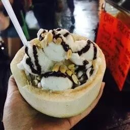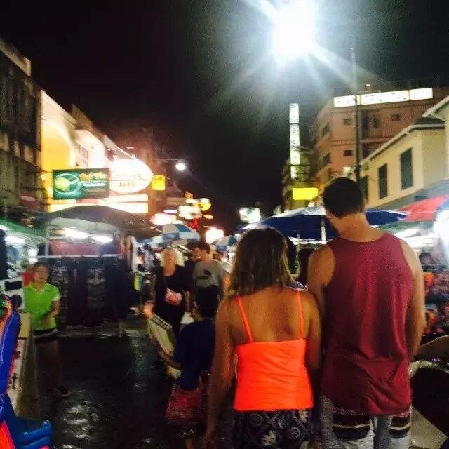 好吧,我懂了,你们姐弟两都是名副其实的吃货啊,跟着两吃货想不变肥都难。东哥无奈的看着我两,换来我姐的一个大白眼,好了好了,快点弄好我要出门觅食了,吃我心心念的芒果糯米饭。三个人在酒店换好衣服换上拖鞋就慢悠悠地朝外面音乐鼎沸的酒吧街,考山路走去。关于考山路:考山路是西方游客来曼谷必去的一个酒吧街。在这里可以买到去往各地的票,有很多票务点,但是价格一般都是去车站买的一到两倍,建议先自己谷歌查好去其他地方驴友的价格参考,免得被宰的太惨。这里还可以订到各种各样的一日游,人妖秀什么的都可以搞定(其实人妖秀建议去普吉看西蒙人妖秀哈)考山路有各种各样的酒吧,越到晚上就越热闹,但在这里本地人不多,都是欧美的国际友人爱来这里high个翻天。路边站着各种各样的拉客的火辣美女,提醒各位注意分辨是不是真正的女人哦,哈哈,一般可以从轮廓和声音分辨出来。餐饮:在考山路一般都是酒吧和餐厅不分家,餐厅提供的食物也大多是西餐为主,一般在180-300泰铢一个套餐,啤酒在100-180之间一瓶。花个200铢便可以坐在人来人往的考山路感受属于曼谷的跳动的肾上腺素。考山路还有各种各样的小摊,卖各种各样的泰国小吃,强烈推荐,味道很不错价格还便宜,一个椰子冰淇淋价格在40铢,一般的泰式炒河粉什么的都是在40铢一份哈。换币:考山路有很多的Money Exchange的点和ATM,建议直接用银联卡取钱,现在的手续费是100铢每一笔钱(泰国银行收取),取钱的手续费中国的银行还会再收一次,三木用的是国内的华夏银行卡,每天第一笔全球取款都是免手续费的。强烈推荐,建议各位如果取钱比较多的话在黄色的ATM上面取,只有黄色的银行是每一笔最多取三万铢,其他的银行都是每笔最多取两万铢哈,汇率都是差不多。我们三个在考山路闲逛,吃货的通性就是,满大街玲琅满目的小吃,远比大胸白腿有诱惑力。快看这个吃的,这个汤好黑暗的样子啊,帮我和老板说说我也要一份。东哥看到一个摊子摆满了各类蔬菜和肉食,老板熟练地把食材放到锅子里,混合煮个两三分钟,再打开锅盖打包好,类似于国内的麻辣烫串串这样,最后所有的食材都在黑兮兮又带点屎绿色的汤里,看着毫无食欲,简直就是黑暗料理啊,犹如油漆一样的颜色。真的吗,东哥你确定?可能难吃爆表啊。一边和老板说放蔬菜猪血和猪肉,老板对我笑笑问我是哪国人泰语说的真好,给我加了点猪肺进去。我看得很忐忑因为我来了这么久还没有看到过这样的菜,最后汤的颜色也是醉人的黑漆漆啊。(40铢左右)走过一条街,看到路边有一家泰国的饭店,隔老远就可以看到架着的烤鸭。我们去那家吃吧,我看到了还有猪脚饭,哈哈,终于找到了,之前和你说了好多次我学校里好吃爆了的猪脚饭,今天老姐和东哥可以先试试泰国的猪脚饭是啥样了,应该没有我学校的好吃。哈哈。三个人拉个位子坐下,看着灯红酒绿的考山路,点了两个猪脚饭和一个烤鸭饭,味道还不错,三个人的同感就是不够辣,没有辣椒啊,三个湖南人都开始吃甜食了,哈哈。老姐说要找芒果糯米饭和椰子冻,找了好几圈,都没有发现,就现在考山路买了个椰子冰淇淋开开胃,异常的好吃(40铢),吃完冰淇淋里面还有椰子肉可以挖着吃。考山路走了一圈,把没见过的小吃都吃了一圈,三个人摸着圆滚滚的肚子打道回府了。回到酒店,东哥拿出刚打包的那碗黑暗料理汤。我来先试试毒,不错的话你们就都可以吃了,难吃的话就直接倒了。东哥小心翼翼地舀了一小勺。