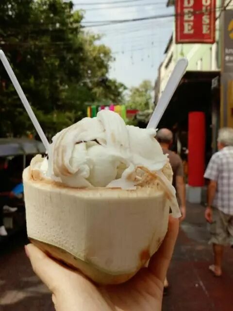 椰子冰淇淋是泰国的爆款!天然的椰子碗配上椰子味的冰淇淋,撒上花生、果仁等配料,口感超正!火热的夏天,配上入口即化的冰淇淋,让你根本清爽一整天。