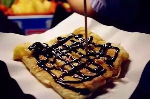 配上巧克力酱、果酱及其他配料,泰国煎饼就这样诞生啦,咬一口,让你甜到骨子里去,忍不住说:老板,我还要!