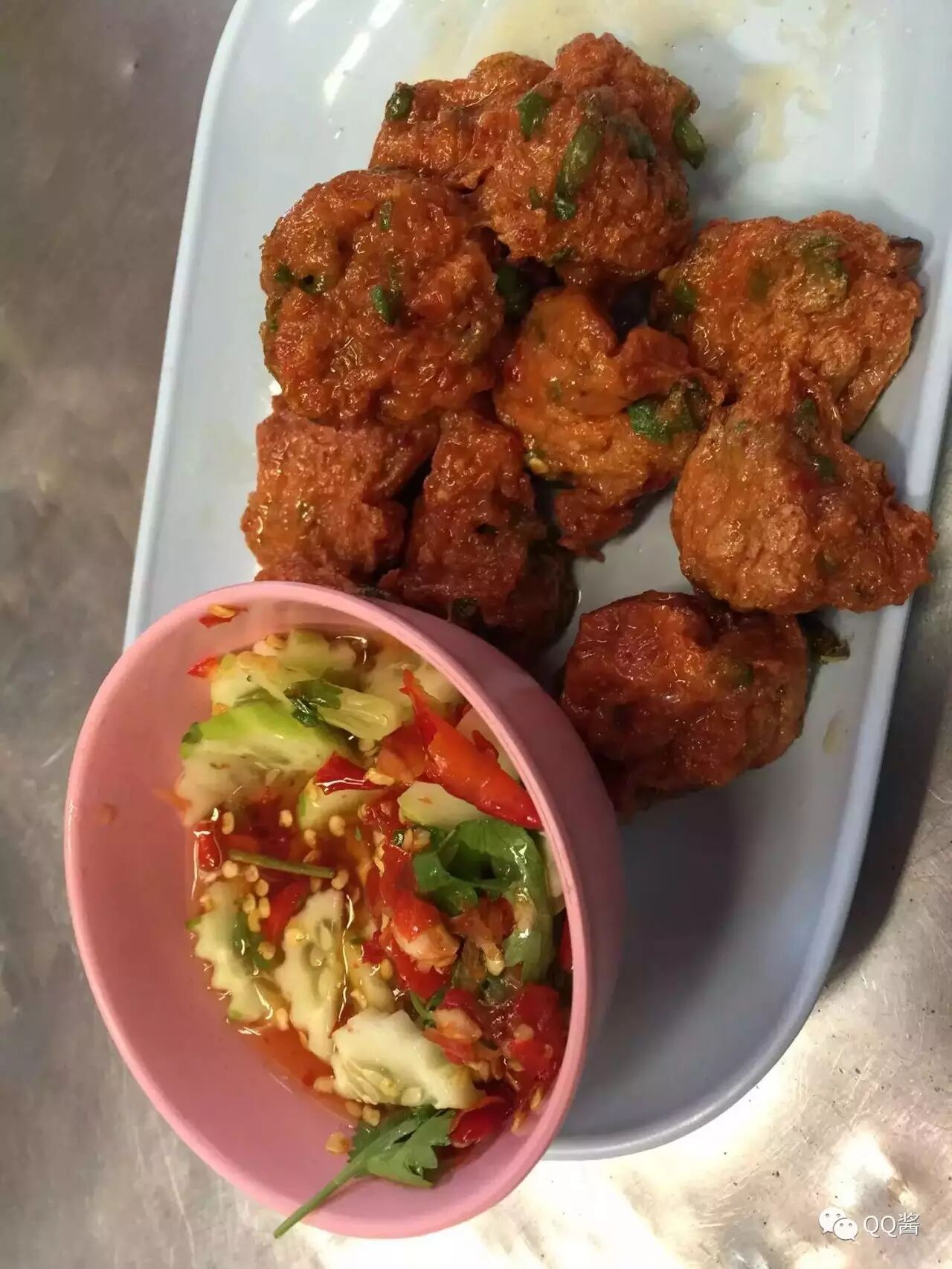 先来个最喜欢的炸丸子。东南亚真的很爱吃丸子。。口味酸爽弹牙,一点不油腻,炸之前肉都腌制过很进味道。吃的时候沾酱黄瓜西红柿柠檬泡椒汁,我们最后连蘸酱里面的黄瓜和西红柿都吃完了,十几块一份,推荐程度☆☆☆☆☆