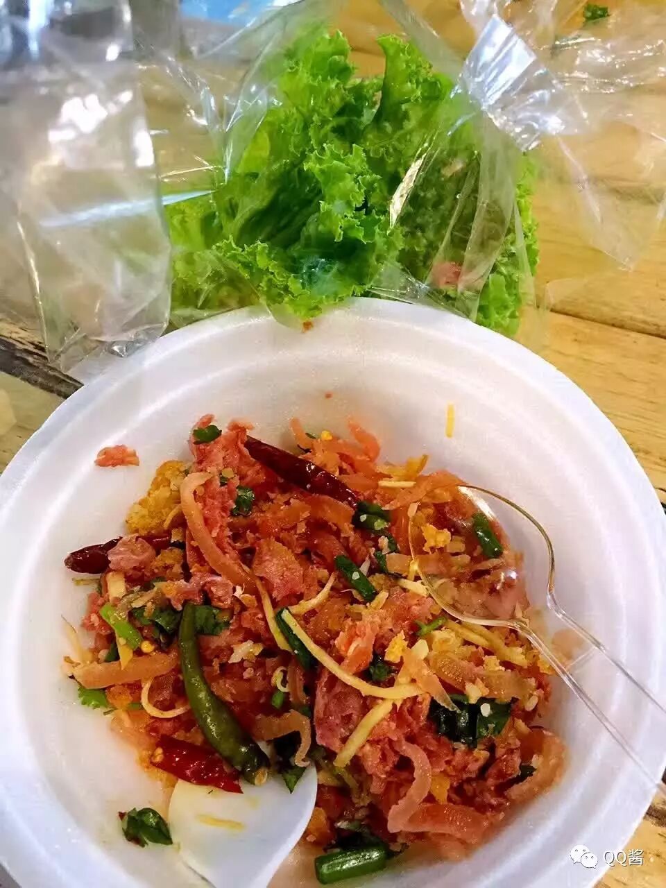 炸丸子+火腿+猪皮+生姜+辣椒+柠檬+炒米饭等佐料,用生菜卷着伙好的这一碗吃,味道爽脆,满口留香。人民币8元。