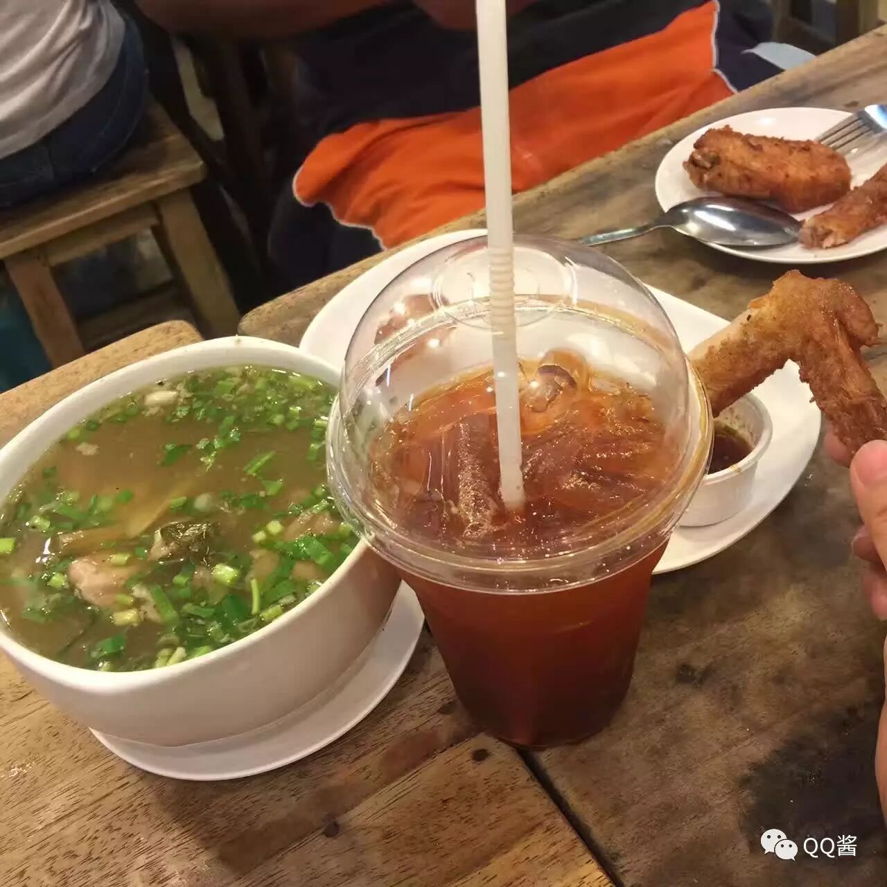 炸鸡是每桌必点的。吃完了才想起来要拍照。。跟韩国发干的炸鸡不一样,这个炸鸡不面不油不干不柴,脆又嫩,粘上酸汁料很开胃,20元一份。绿色汤碗是柠檬鸡,口味不太好形容,有点像是柠檬味的鸡汤,柠檬的酸味很浓覆盖了鸡汤的味道,是饭前开胃汤。柠檬红茶很浓,曼谷天气太热了,体感温度36°,必须得来点冰的镇一下~