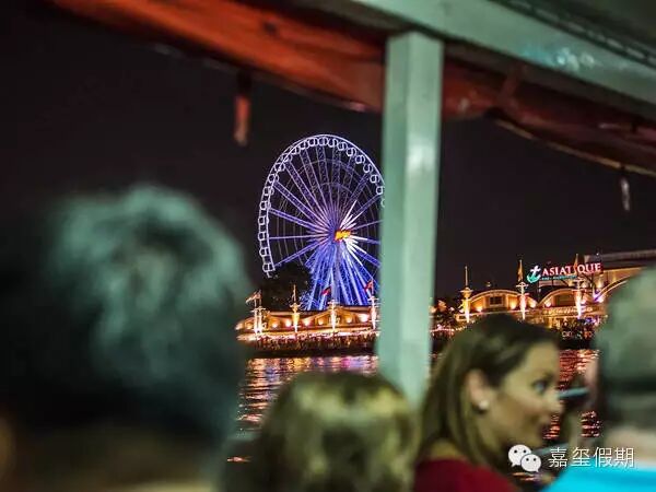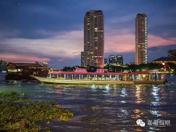傍晚时分在码头等候去河畔夜市渡轮的游客熙熙攘攘,其实傍晚在曼谷的河边欣赏晚霞和落日也是件美事。渡轮挺漂亮,坐上后大约15分钟就可以远远地望见河畔夜市的标志建筑:摩天轮了