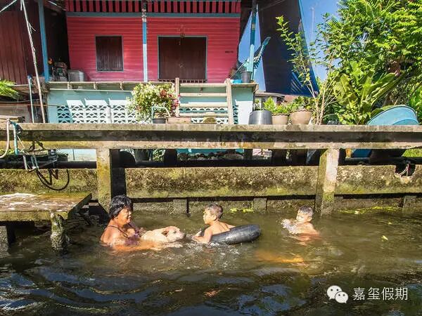 沿着河岸两侧有许多水边屋,这些屋子的结构很简单,甚至可以说是简陋,不过沿着河坐落在漂亮的南国植物里,倒也是一派独特的景致!