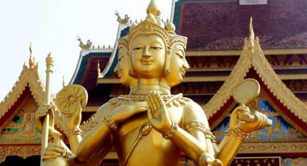 四面佛位于伊拉旺神祠中,供奉的神像高约4米,前后左右有四副面孔,分别代表慈、悲、喜、舍四种梵心,凡是祈求升天者必须勤修这四种功德。神像摆放在工艺精细的花岗岩神龛内,正襟危坐,全身金碧辉煌,四面都是同一面孔、同一姿态。