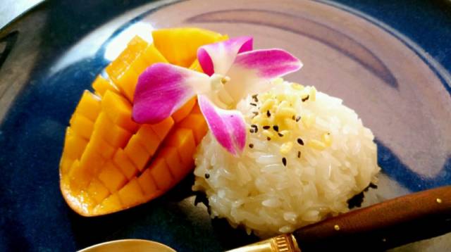 芒果糯米饭,看名字就知道花头啦。新鲜芒果切块,豪爽的半个芒果划三刀,一勺糯米饭,上面撒点咸鲜味儿的脆米,再淋一勺椰汁,芒果澄黄,糯米洁白,椰汁写意,一口咬下去,满嘴香甜软糯,间或夹杂着脆米嘎嘣的口感。街边摊档卖新鲜,甜品店卖文艺,上得厅堂下得厨房。