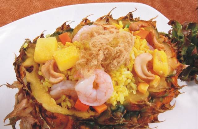 泰式菠萝饭以炒为主,菠萝饭诱人的口感和颜色都让人流连忘返,选用新鲜的菠萝掏空,然后将菠萝果肉炒入泰式香米饭当中,使得炒饭的风味独特,口感鲜甜,看上去很色香味俱全。