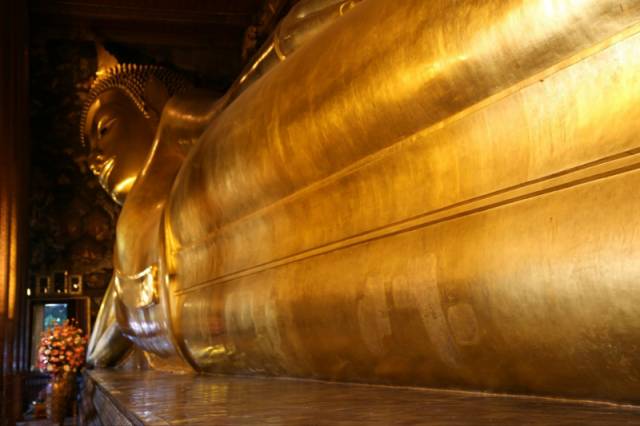 这座寺庙闻名于世的特色主要有两点,其一就是寺内有一尊大佛卧于神坛之上,为曼谷市内最大卧佛,全长46米,身高15米,为铁铸,包金,镶有宝石。几乎占据了整个大雄宝殿的空间,拍照时很难拍到全景。