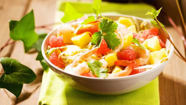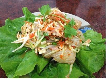 这道热沙拉将清爽的柚子拌进用椰奶、红咖喱酱、辣椒油、糖混煮的酱料中,加进虾仁或鸡丝,有些餐厅还会再加上烤过的椰丝或碎花生。
