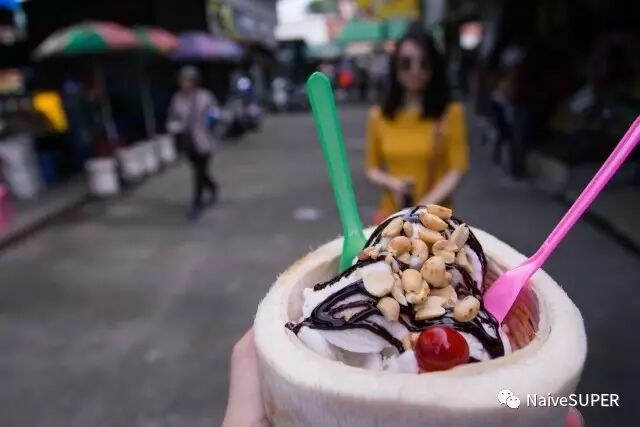 推荐几家一定要吃的。在登船码头的左侧,有一家很有名的椰子冰淇淋,清凉无比,炎炎夏日吃完一盅还想再来一盅。不远处有一家很难等位的泰式米粉,一定要点辣味的,酱料鲜甜刺激,很过瘾,但分量很少我可能要三碗才能饱。芒果糯米饭也是必吃的,甜而不腻,米粒不黏甚至有些嚼劲,味道都差不多,挑一家你看得顺眼的买即可。