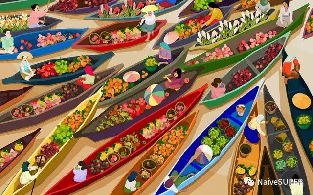 东南亚很多同类型的水上市场,应该是河流众多的缘故。下面的作品是中国艺术家郭静瑶所画,一座印尼的水上市场,与泰国的这座其实很像。
