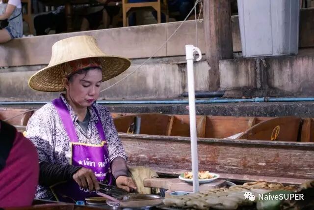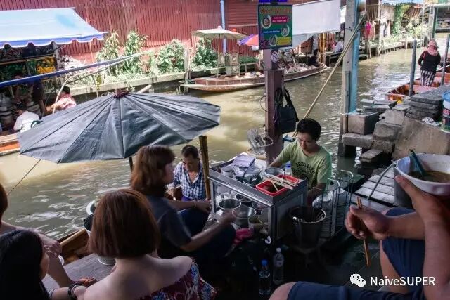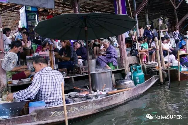 贩卖的商品,虽说大多都是针对游客的手工艺品、水果、食物等,但那种热闹的市场气氛总是很容易调动起人的购买欲。其中三五家经过当地人验证后的地道店铺,更是人气爆棚,排队都要排好几轮才能吃得上。坐船时如果看到什么想吃的或者想买的,向店家或船夫挥挥手,有的店家会拼劲全力地用竹竿把你坐的船捞过去,有的懒一点儿的店家干脆扯着嗓子说着泰式英语,老远连比划带猜地谈好你到底要什么到底接受多少钱,双方直接在竹竿末端的竹筐里完成钱货交换。
