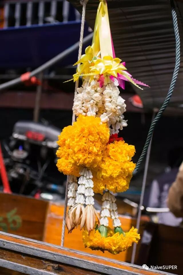 建议提前购买船票,到达后即可登船。船有两种,手摇船和电动船,乘坐手摇船切记带伞,不然一圈逛完可能就有墨镜印在脸上了。很多船夫都给自己的船挂上了茉莉花串儿,一是祭拜故去的泰皇,二是为日常生活增添一点香气。