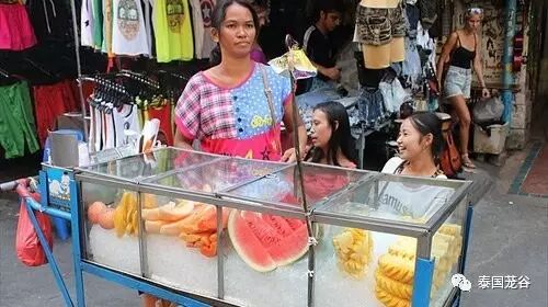 泰国路边很多水果摊,狭长的冰柜裡放著泰国盛产的水果,西瓜、凤梨、芭乐、木瓜、芒果、哈密瓜等等等,在炎热的夏季来几口清凉的水果保证让你暑气全消,更讚的是价钱非常便宜,一大袋的西瓜或哈密瓜只要10泰铢左右喔!然后还有更讚的是,老板会帮你把水果削的好好的,你只要拿竹籤插起来吃就行萝!