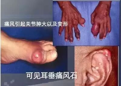 当体液中尿酸浓度超过此值时,将因过剩而在组织中沉积,这种尿酸盐的结晶沉积在关节滑膜、关节骨、软骨而导致痛风性关节炎,沉积在皮下则形成痛风石。