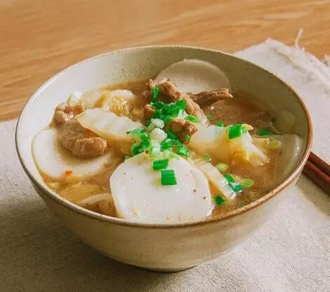 每当早起,或是家中有剩菜剩饭的时候,妈妈就会从水中捞出几条年糕,细细切片。青菜白菜任何菜蔬都好,吃剩的菜汁肉汤也不错,一起下锅,再倒入一碗过夜的米饭,就是特别丰盛的一餐。没有荤菜的时候,加一小块猪油,那滋味更是鲜得舌头都要吞落去。