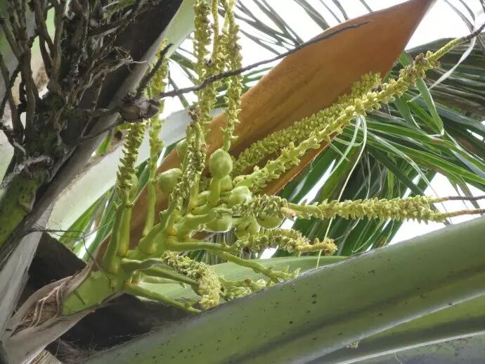 花开后,绿皮逐渐萎缩枯干,小椰子的雏形已经出来了