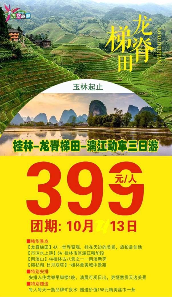 玉林指定时间火车站集中乘动车前往桂林;抵达后乘车前往龙胜。途中可自费游览:游览【义江缘】(费用100元/人自理,游览60分钟,赠送河灯活动和长桌宴),以清澈的义江为依托,整个村庄以古朴为基调,配上苗、瑶 、侗 、壮等多个少数民族特有风情的完美演绎,极具特色的民间手工艺品走廊,还有浓情的“民族风情”表演,游览面积达一千余亩的大型民族风情主题景区,形成桂林独特亮丽的旅游景观,被誉为“桂林风情第一村”。抵达梯田景区换乘景区专用交通车前往游览世界上最美的梯田群---【龙脊梯田】(景区换车费40元/人自理),抵达平安壮寨入住酒店。