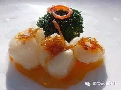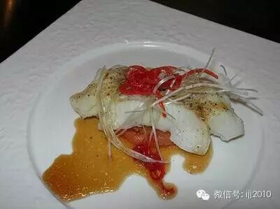 配酱:海鲜汁(浇淋酱汁装盘的方法下面的菜均同)。