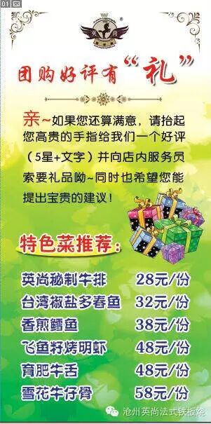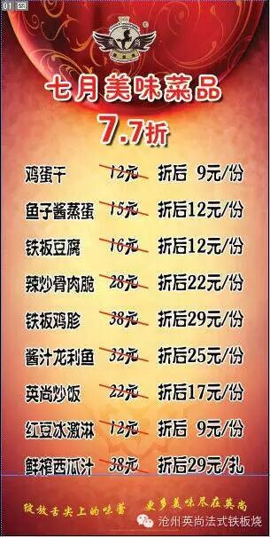 7月来英尚铁板烧 特色菜品只要7.7折哦 2023-04-19 23:50:29 炎炎夏日要怎么过?给亲们来点儿神清气爽的消息~七月来英尚铁板烧色特菜品7.7折哦~ 4八4很兴奋呢? 喜欢团购的亲们也有福利哈~ 地址:荣盛购物广场五楼 英尚法式铁板烧 电话:03175577766